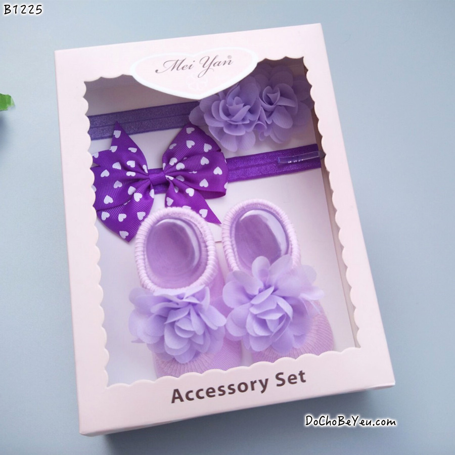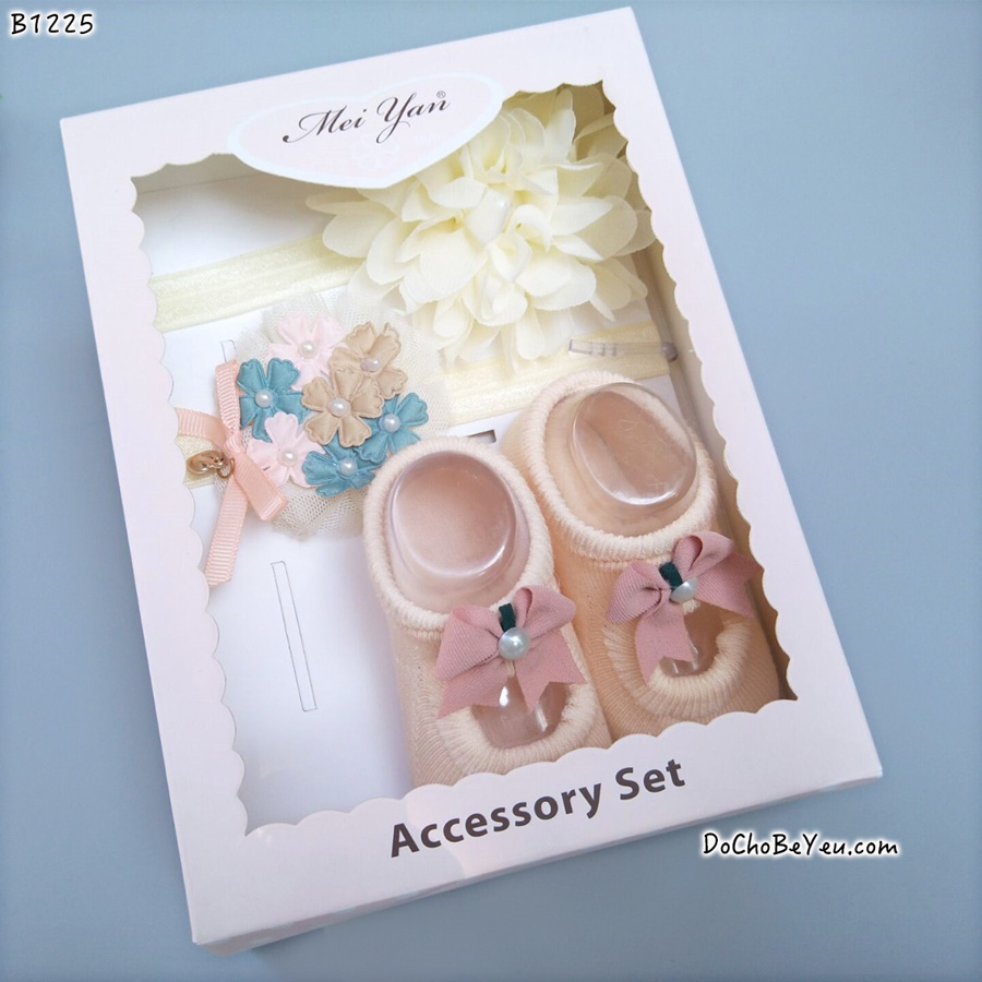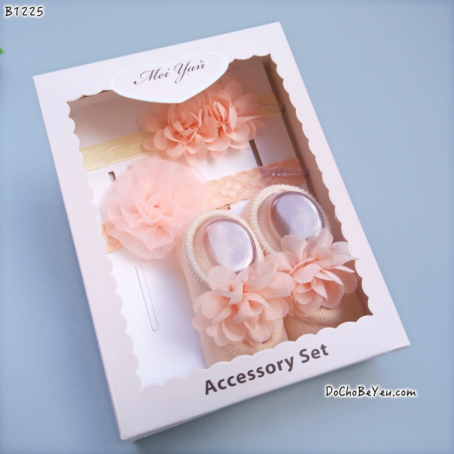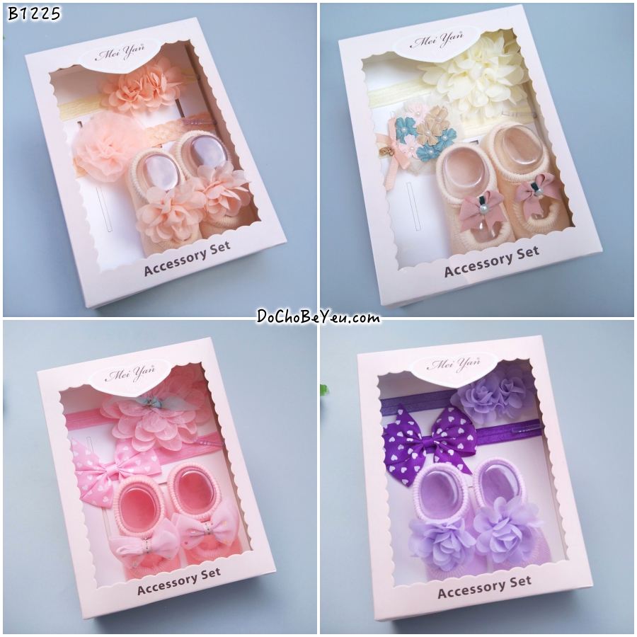 Set gồm 2 băng đô + 1 vớ cho bé sơ sinh, đựng trong hộp sang chảnh, có thể làm quà tặng. Giá chỉ 90k.