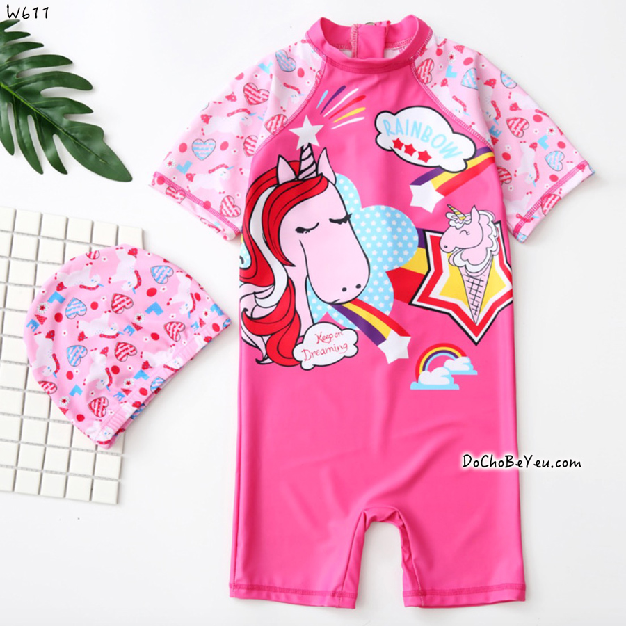 Đồ bơi cho bé gái 1-7 tuổi hình chú ngựa Pony cực iu cùng tong màu hồng xinh xắn nhẹ nhàng mát mắt bé nhìn đã thích,có kém nón với chất liệu vải bơi bền đẹp, from chuẩn cho bé dạng bơi liền giúp bé giữ ấm cơ thể tránh cảm giác nóng rát khi bơi trời nắng yên tâm không sợ đen bé và quan trọng hơn là đem lại cảm giác thoải mái cho bé khi bơi mẹ nhé.