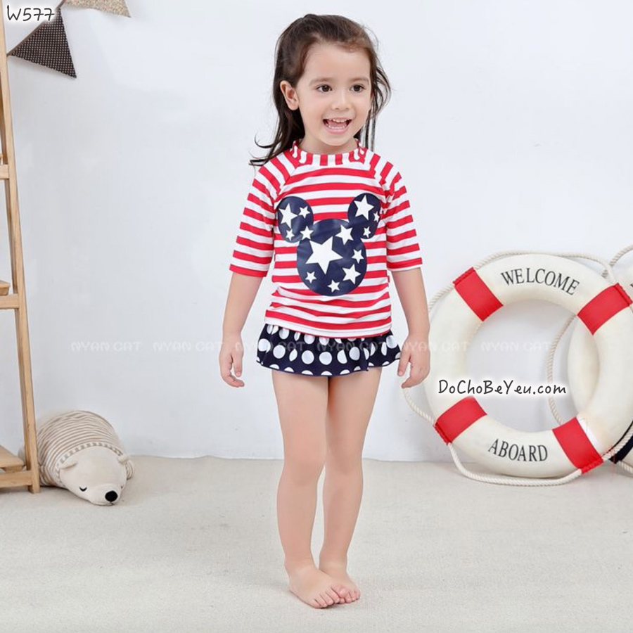 - Đồ bơi cho bé gái tay dài tiện lợi, dễ mặc, bảo vệ bé đỡ gió lạnh, nắng đen tay. Giá 170k size 2 đến 7/8 tuổi có kèm nón. Mẫu áo sọc cùng họa tiêt mickey cực iu mẹ rinh ngay cho bé một bộ đi nà.
