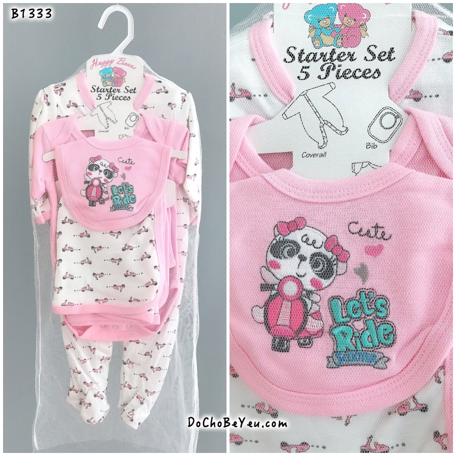 Đồ sơ sinh Xuất khẩu Thái Lan 5 món kèm móc sang xịn - đựng trong bao túi lưới có thể dùng làm quà tặng luôn.