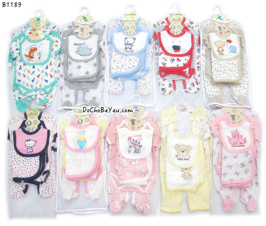 Đồ sơ sinh cho bé trai Thái Lan kèm móc sang xịn - đựng trong bao túi lưới có thể dùng làm quà tặng luôn.