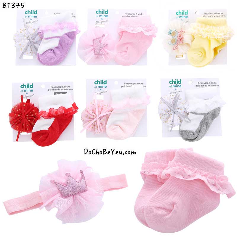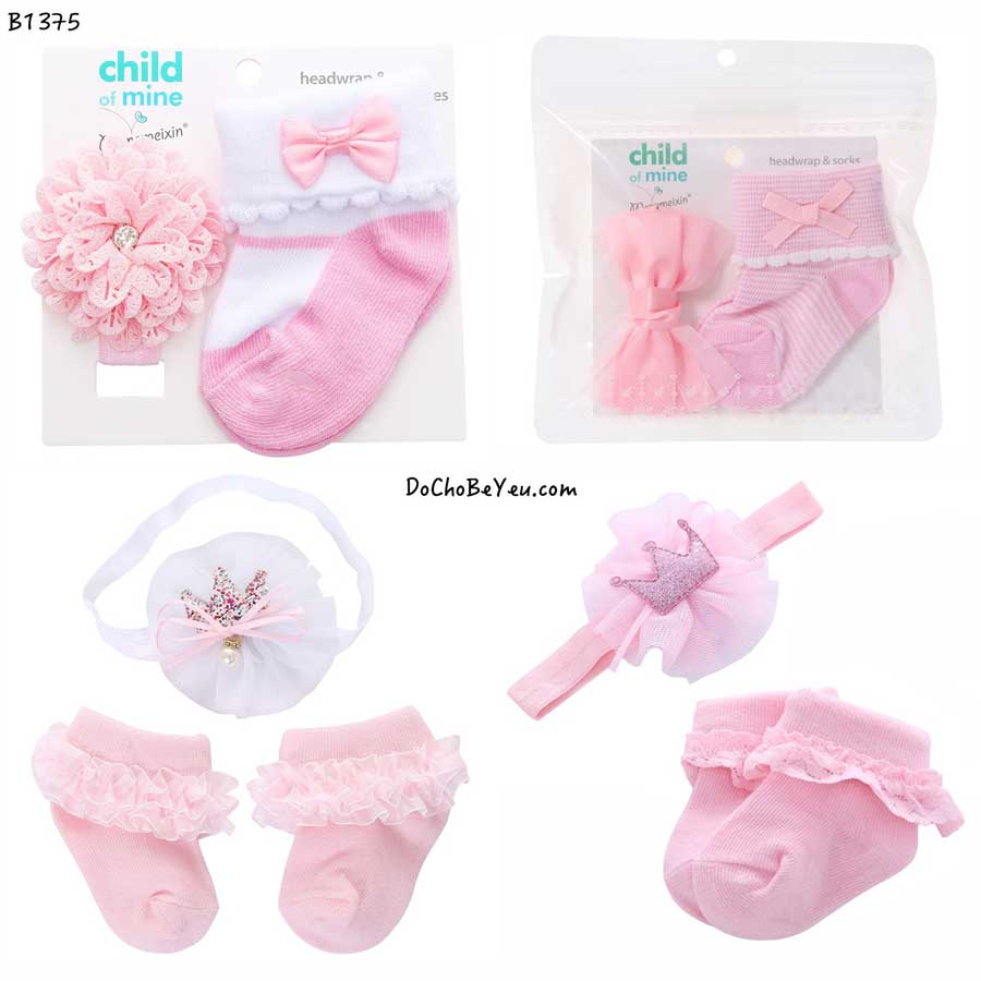 Đồ sơ sinh xuất khẩu cho bé gái dễ thương cùng tông màu gồm 1 băng đô và 1 đôi vớ ren kiểu hoặc vớ cổ bẻ đính nơ điệu đà.
