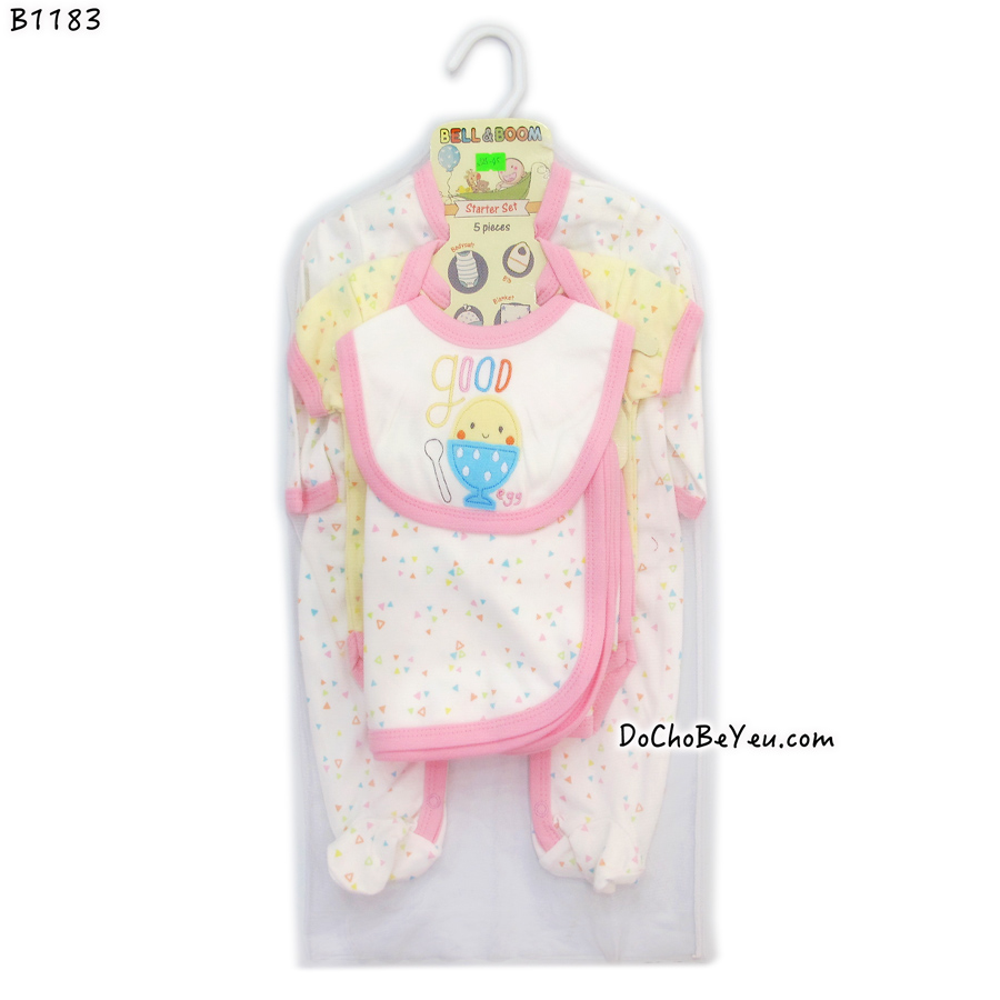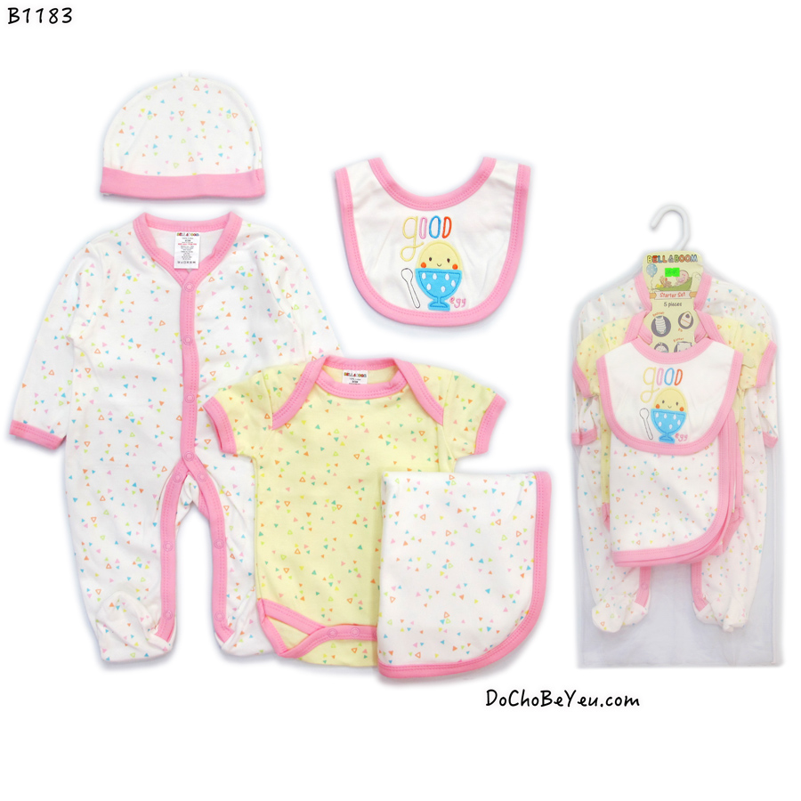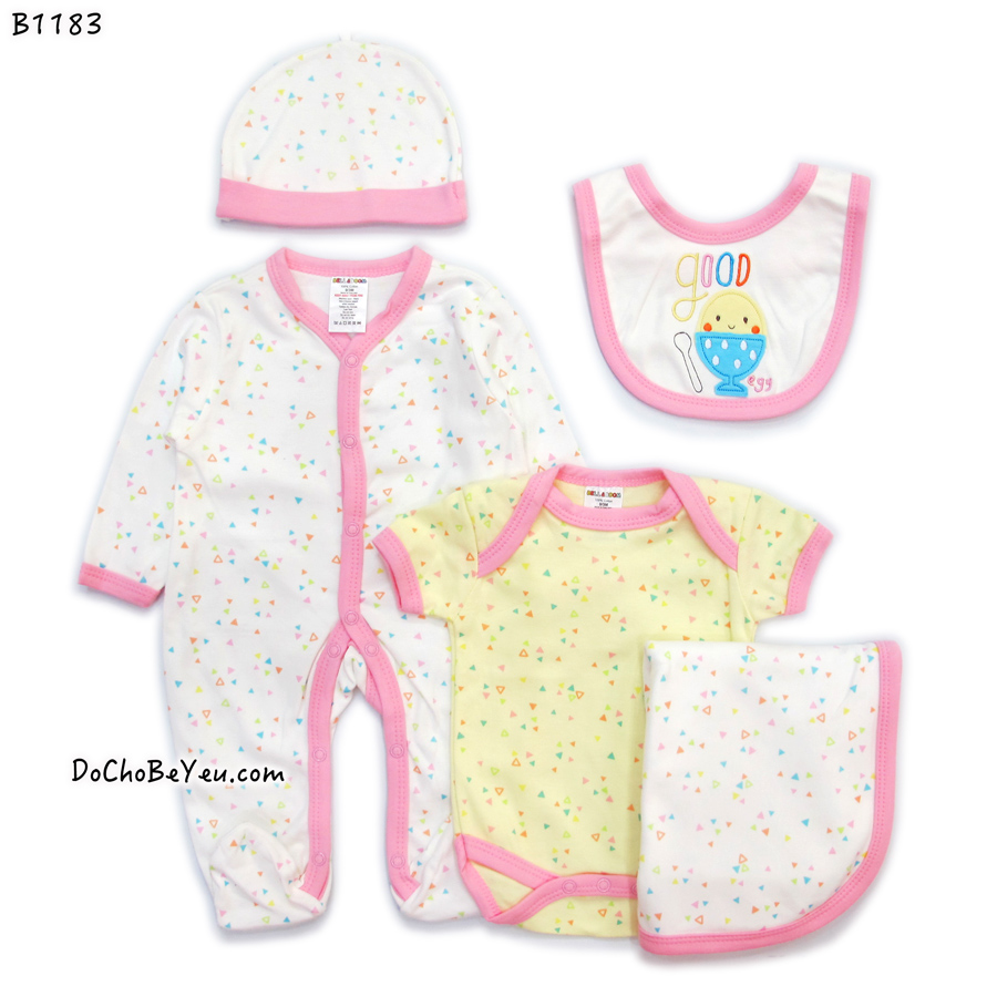 Giá chỉ 225k/set tới 5 món phối cùng tông màu trang nhã: 1 body dài liền vớ cho bé mặc ra ngoài hoặc ban đêm, 1 body suit thoải mái - mát mẻ cho ban ngày, 1 nón sơ sinh , 1 yếm sữa/ấm cổ, và 1 khăn vuông che bé/ quấn bé/ hoặc trải cho bé nằm.. Quá đầy đủ và tiện lợi luôn nhé. Mẹ khỏi phải đau đầu mix match sao cho cho đẹp, cứ nguyên set cùng tông là quá chất rồi.