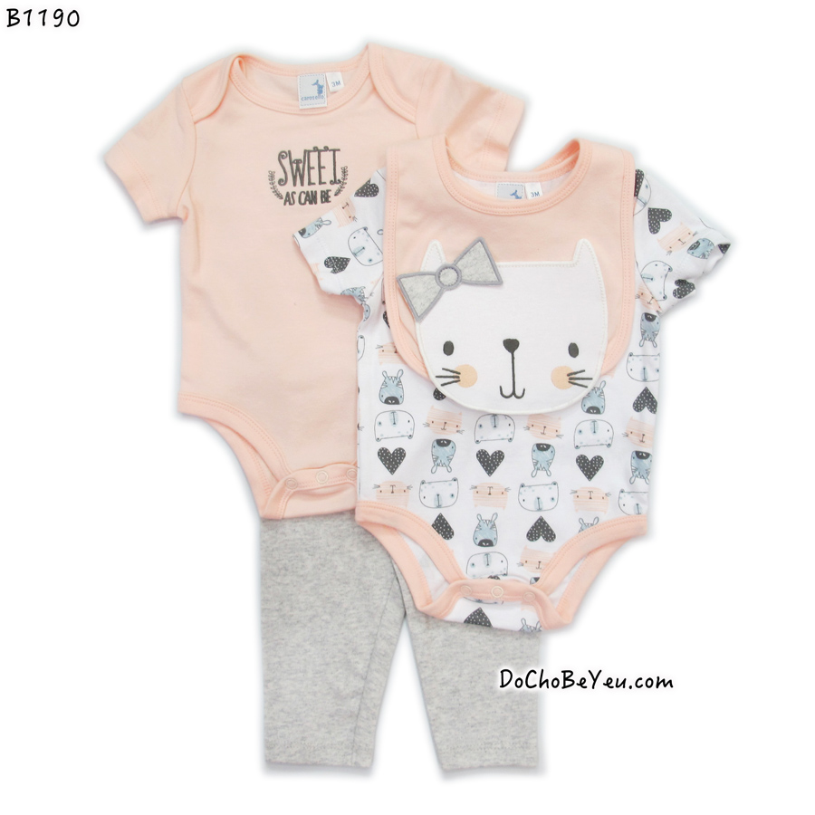 Set đồ sơ sinh cho bé gái 4 món gồm 2 body suit + 1 quần dài + 1 yếm ăn/ấm cổ cùng tông màu. Mẹ có thể mặc được thành tới 4 kiểu: gọn gàng thoải mái chỉ body và yếm cho ban ngày, hay mặc thêm quần dài khi đi ra ngoài, vào ban đem. Hàng xuất xịn Made in Thailand 100% cotton mềm mịn, bảo đảm an toàn cho bé sơ sinh.