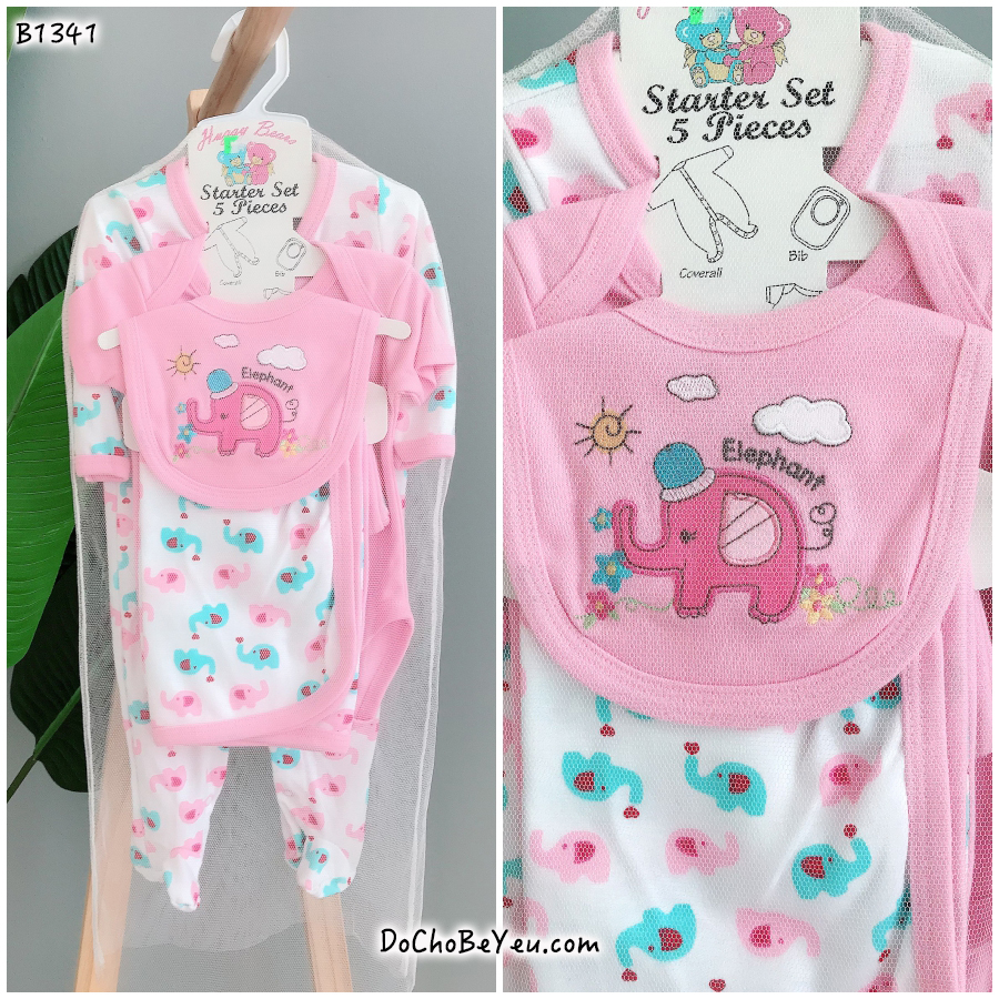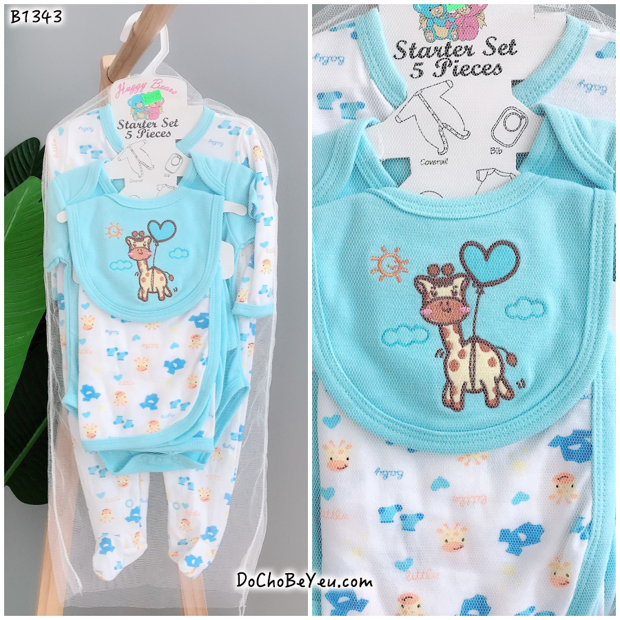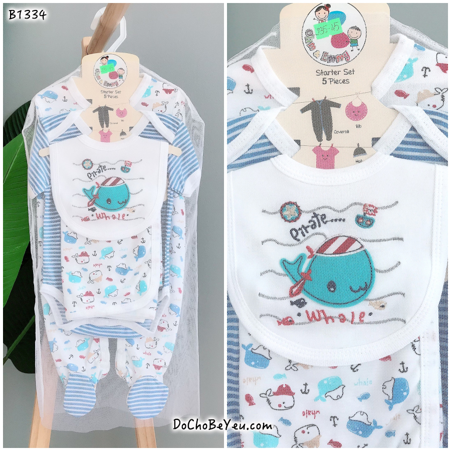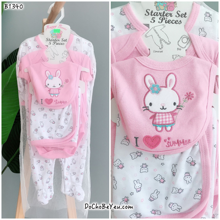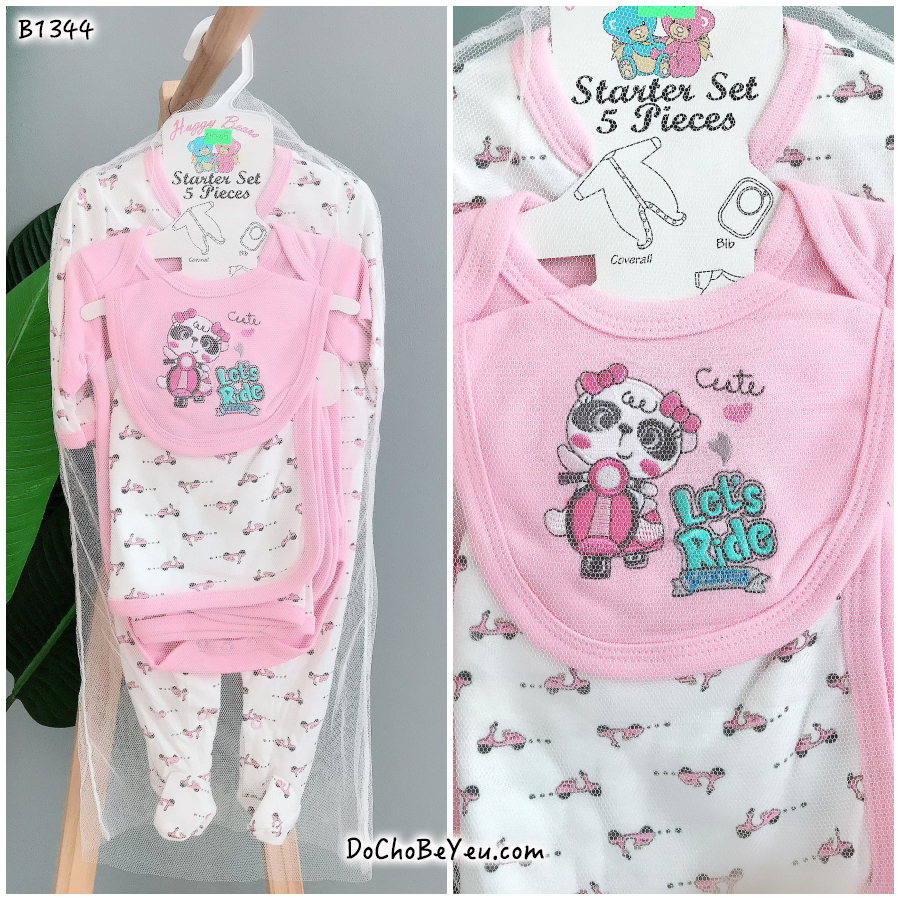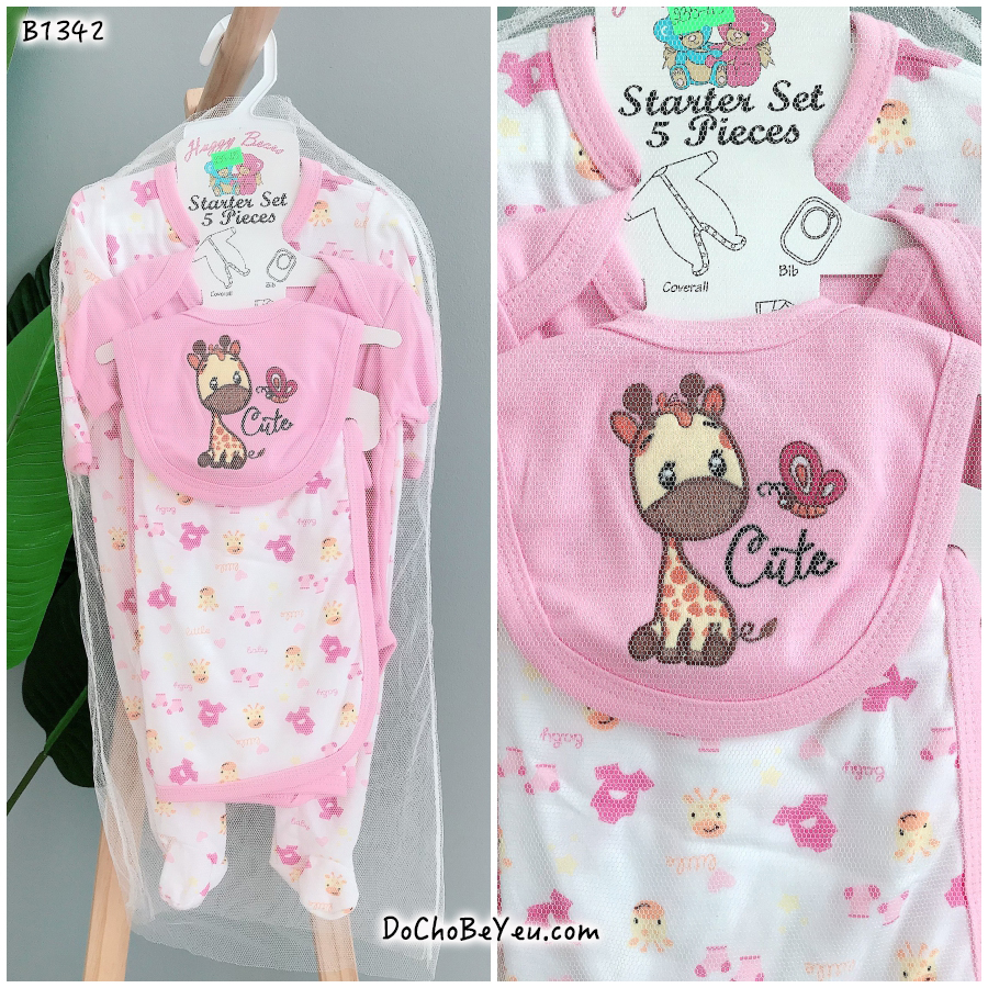 Đồ cho bé sơ sinh Xuất khẩu Thái Lan 5 món kèm móc sang xịn - đựng trong bao túi lưới có thể dùng làm quà tặng luôn.