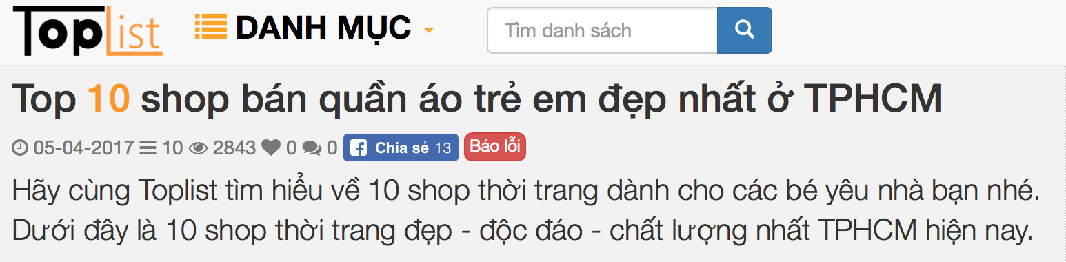 - Đôi khi search thử google lại thấy ra mình có tên trong top 10 shop bán quần áo trẻ em online đẹp ở TpHCM , thì cũng hơi bất ngờ😘😘. Các mẹ xem link ở đây nha http://toplist.vn/top-list/shop-ban-quan-ao-tre-em-dep-nhat-o-tphcm-14444.htm