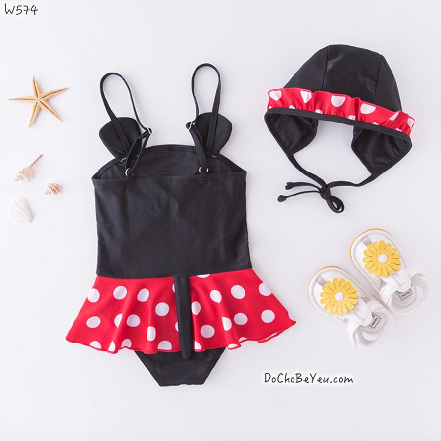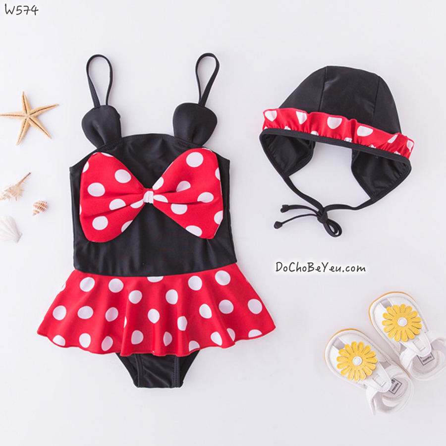 -Đồ bơi cho bé gái dễ thương  mẫu chuột Minnie với 2 chiếc tai phía trước và chiếc đuôi nhỏ phía sau vô cùng đáng yêu, ngộ nghĩnh, chụp hình là khỏi chê nha.Bơi liền kèm nón tông màu đỏ đen nổi bật, size cho bé 1 tuổi - 5 tuổi.