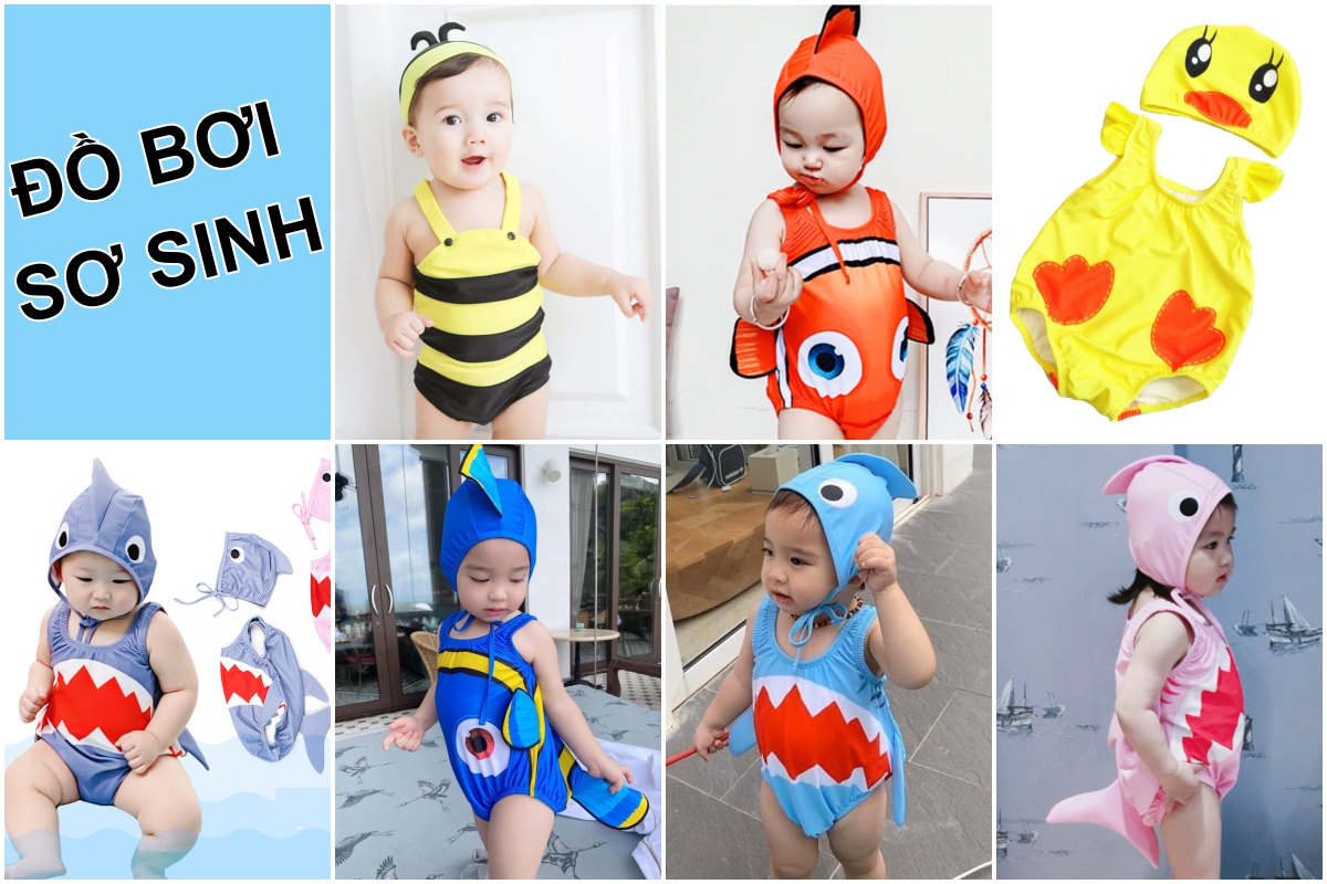 Đồ bơi trẻ em sơ sinh hình cá mập 3D, cá nemo, con ong vàng, con vịt vàng với nhiều màu nổi bật cho mẹ chọn, dễ dàng tìm hay dõi mắt theo bé giữa cả bể bơi.