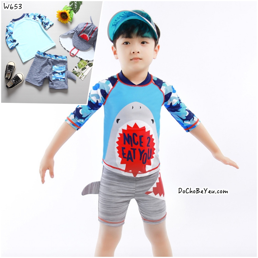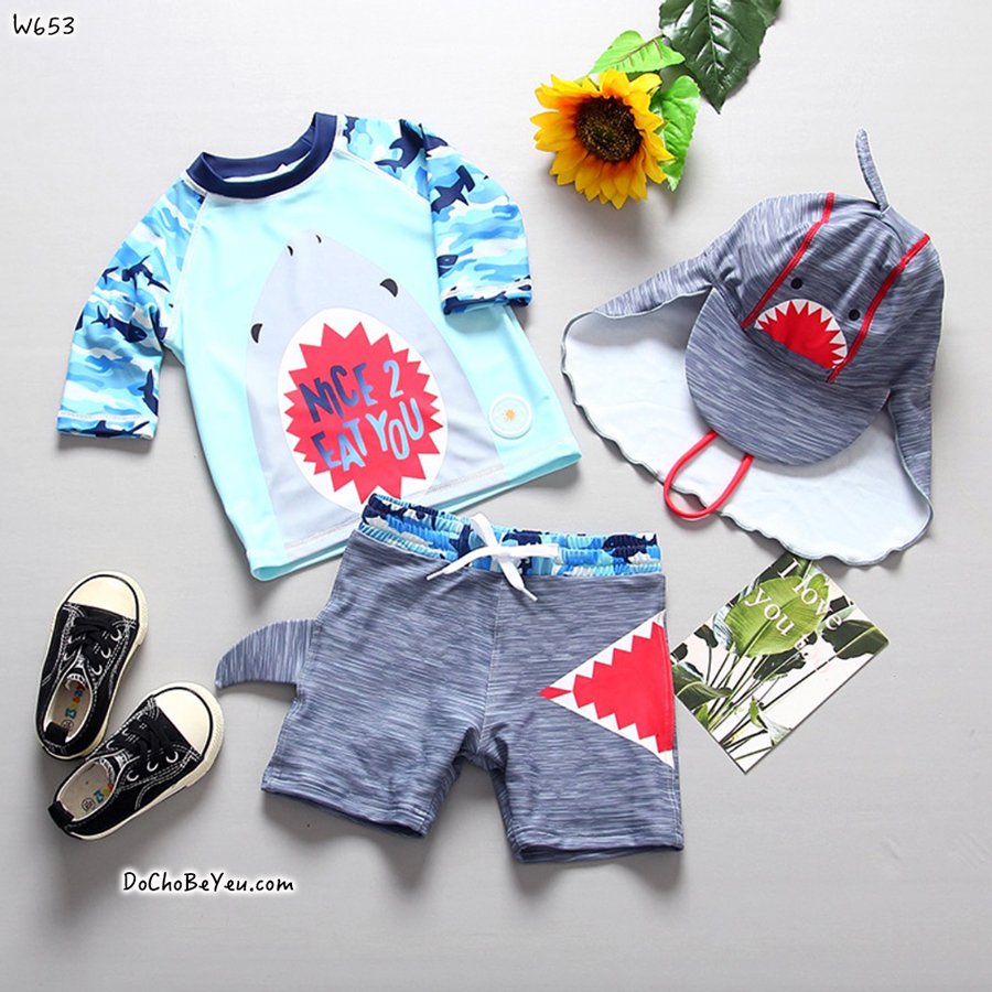 - Đồ bơi cho bé trai áo rời quần rời thoải mái, dễ mặc, dễ vận động. Kèm theo nón che gáy tiện lợi. Set hình cá mập 3D nhìn lạ mắt và iu iu, tha hồ cho mẹ chụp hình.