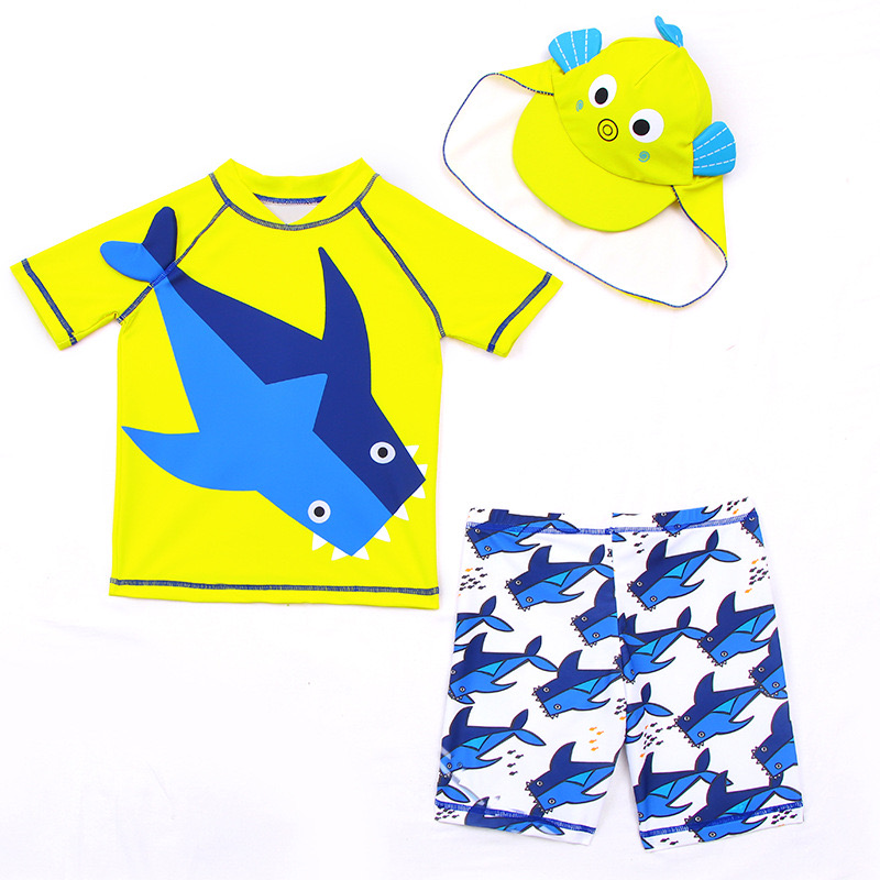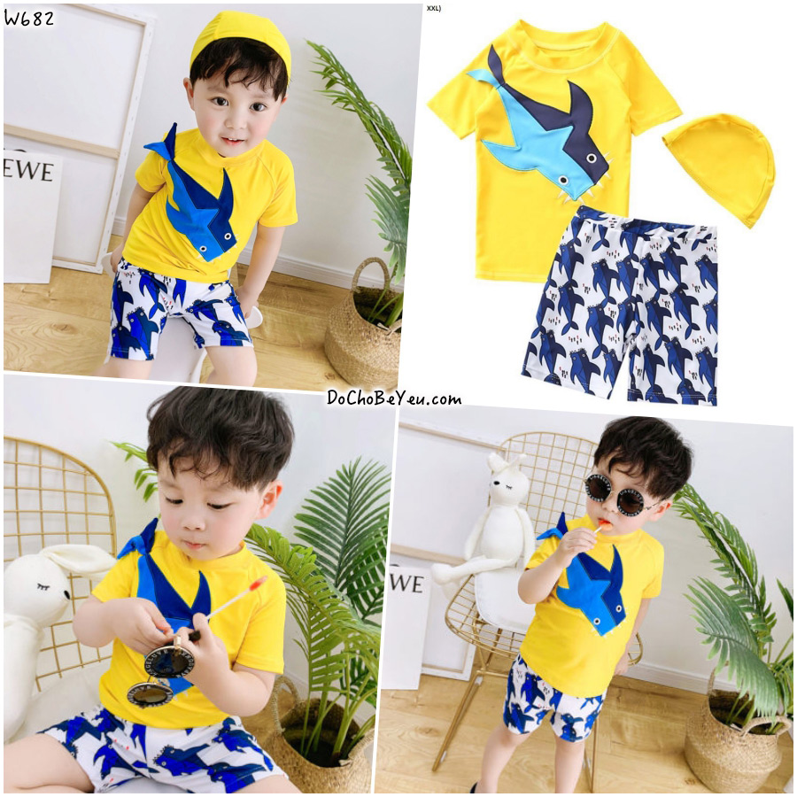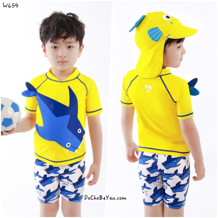 - Đồ bơi cho bé trai áo rời quần rời thoải mái, dễ mặc, dễ vận động. Kèm theo nón che gáy tiện lợi. Set hình cá mập 3D nhìn lạ mắt và iu iu, tha hồ cho mẹ chụp hình.