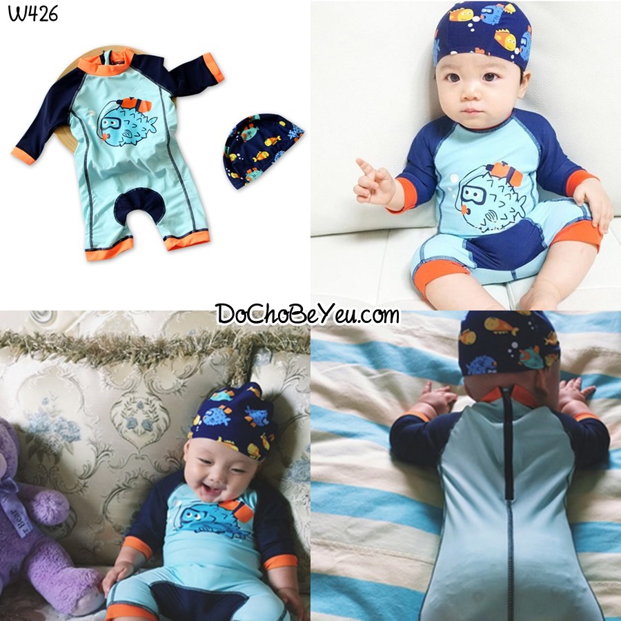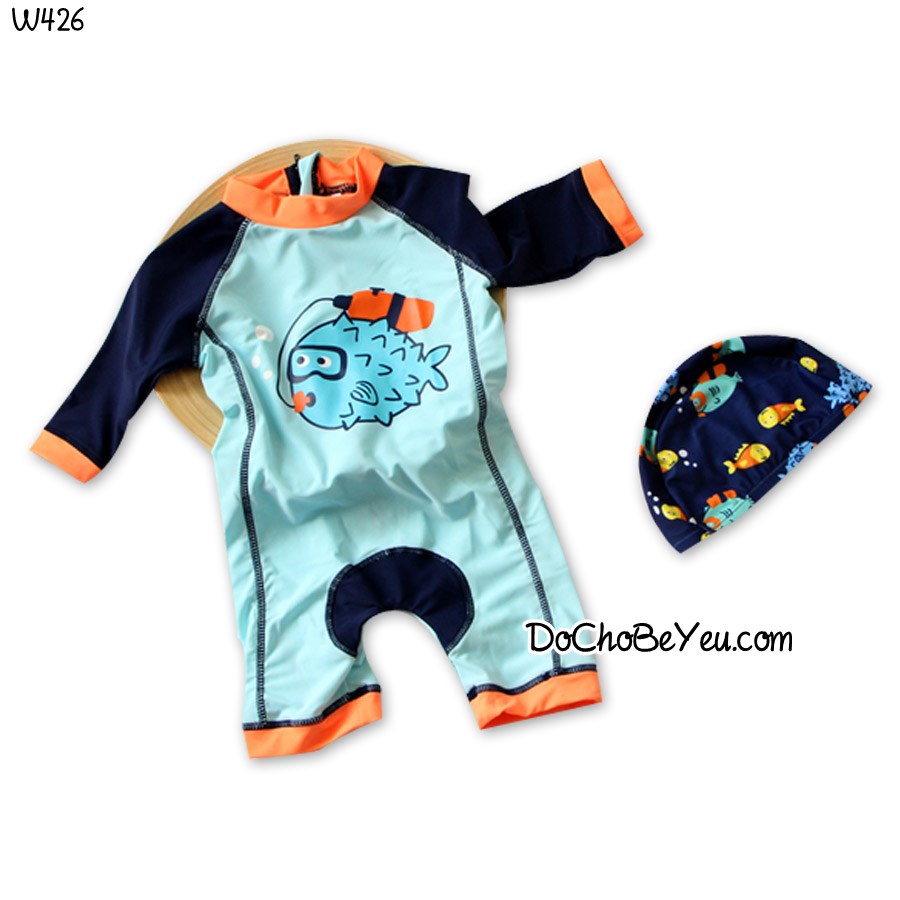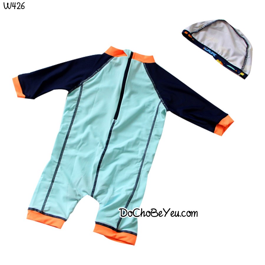 Đồ bơi dài tay cho bé trai quần liền thân có kèm nón che gáy. Size 1-6 tuổi.