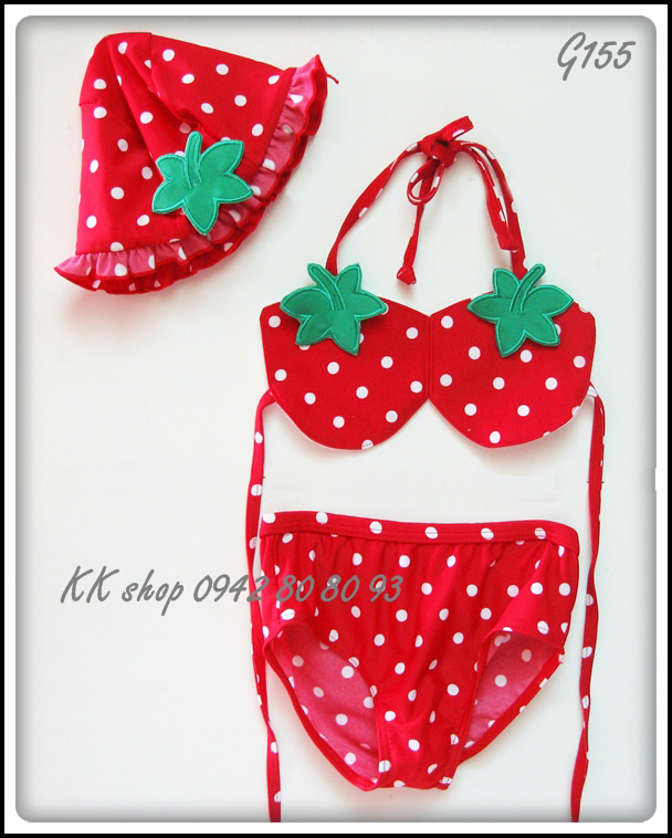 - Đồ bơi bikini cho bé gái mẫu hình trái dâu có kèm nón. Giá chỉ 165k. Mẹ nên sắm ngay một chiếc bikini cho bé diện nha, chụp lên hình cưng iu lắm luôn.