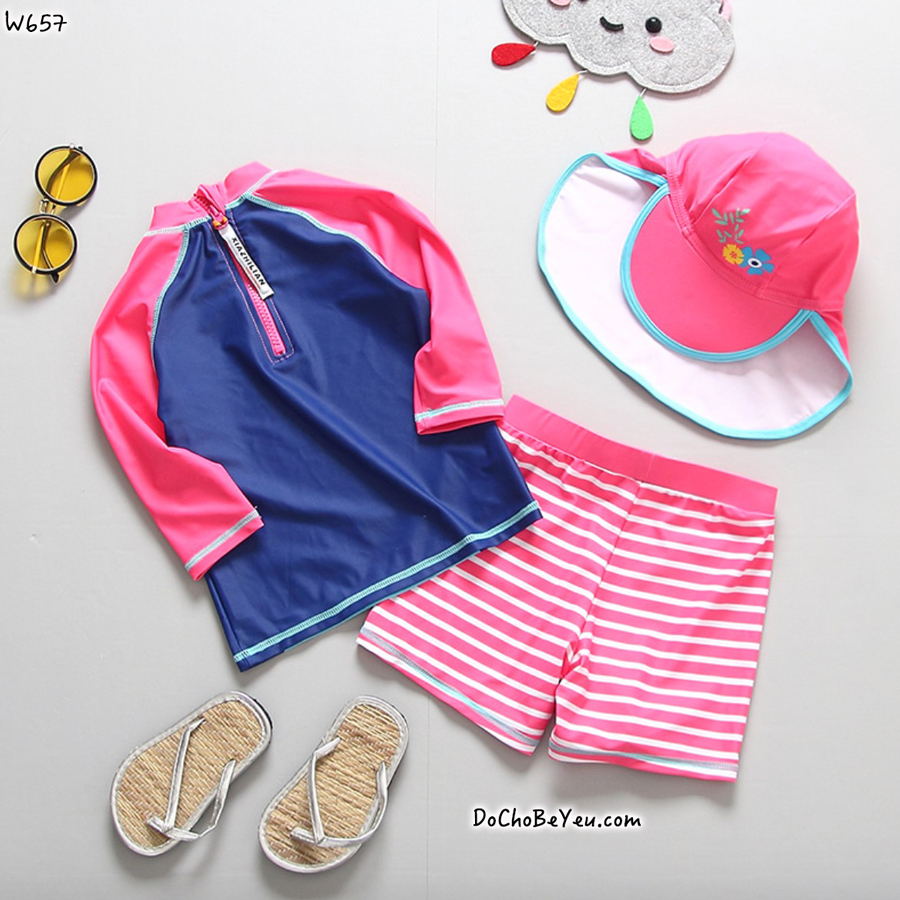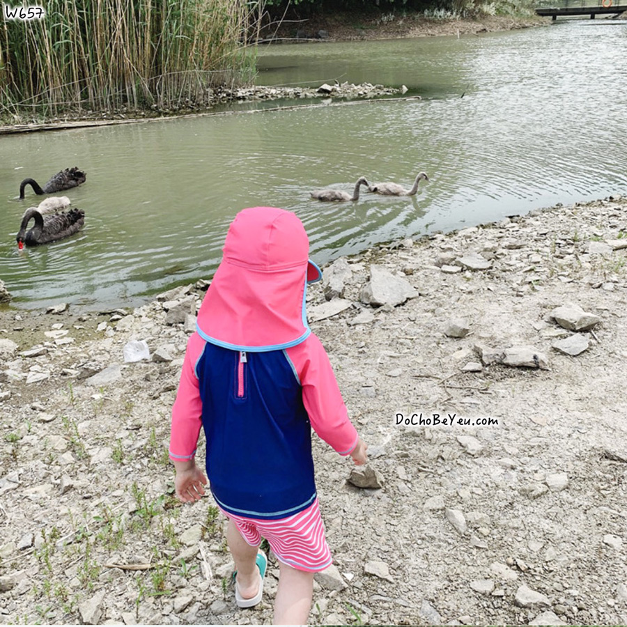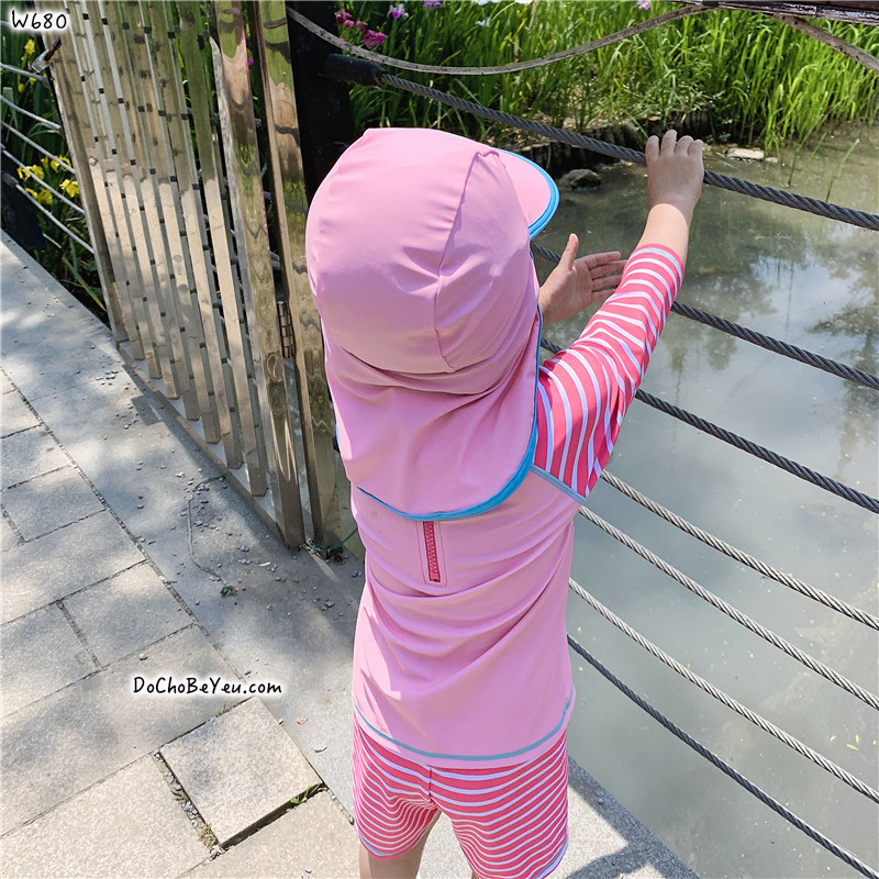Đồ bơi trẻ em gái tay dài quần rời áo rời có kèm nón che gáy chống nắng như hình rất tiện lợi.