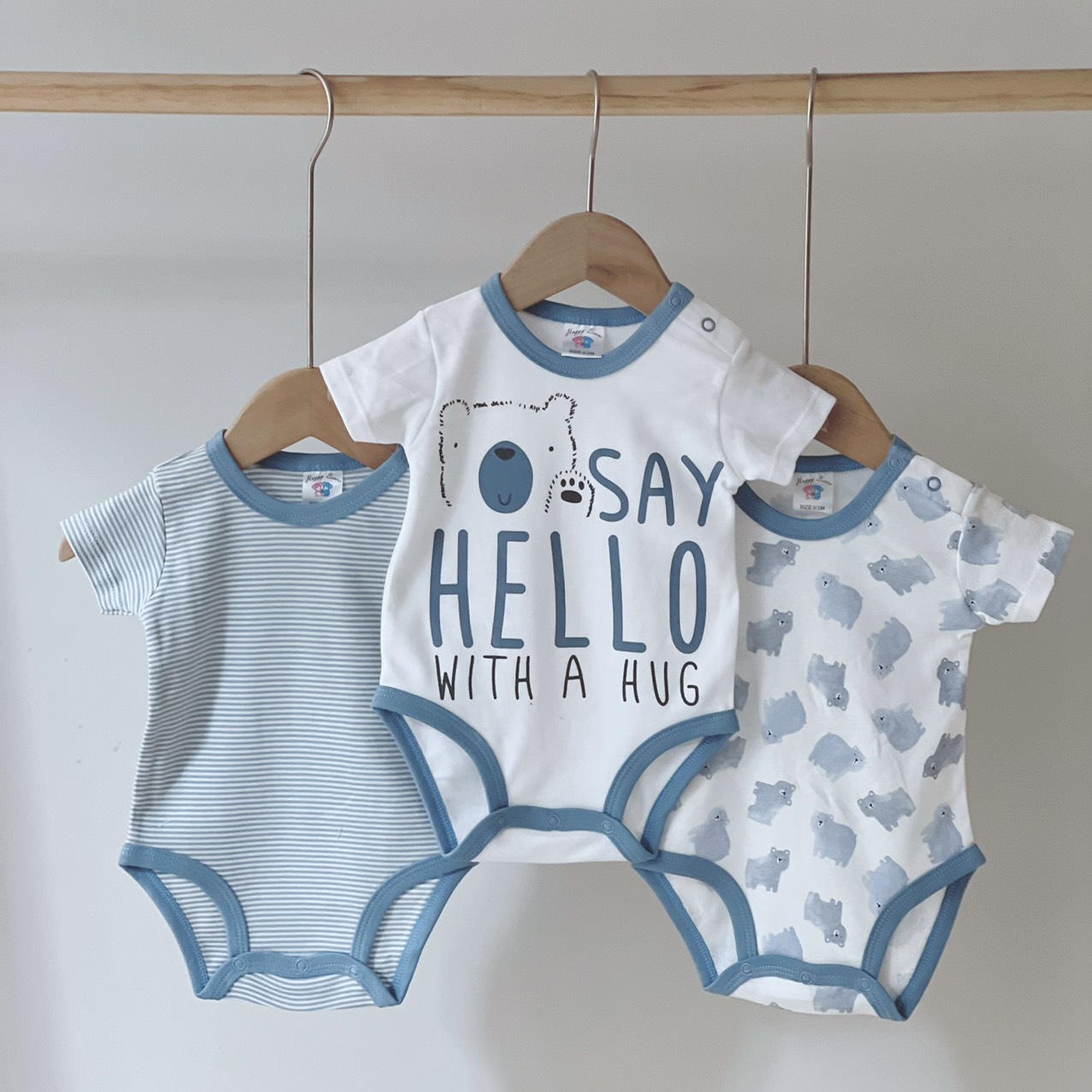 Set gồm 3 Body suit cho bé trai giá 185-205k/set có kèm móc sang xịn như hình, dùng làm quà tặng cho mẹ bầu, bé mới sinh,đầy tháng... đều được.. Size 0-9 tháng.