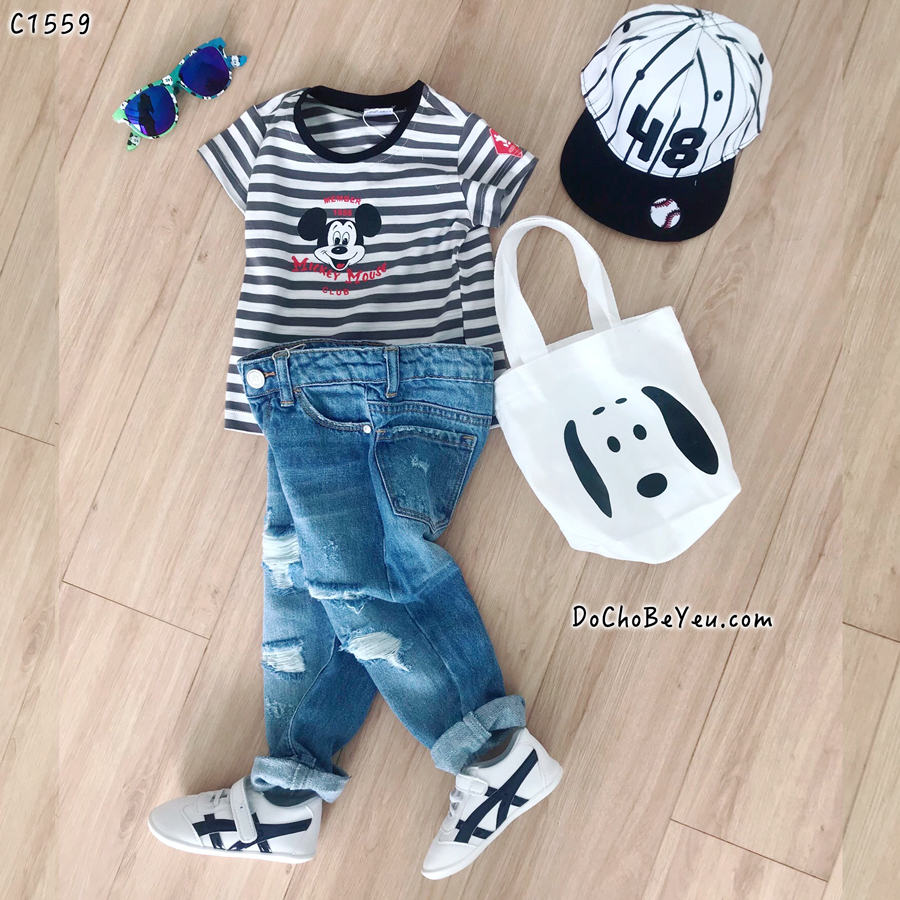 . -Quần jean dài size 9 tháng -4 tuổi . 215k .Aó thun 110k .Nón 90k.Kính 85k .