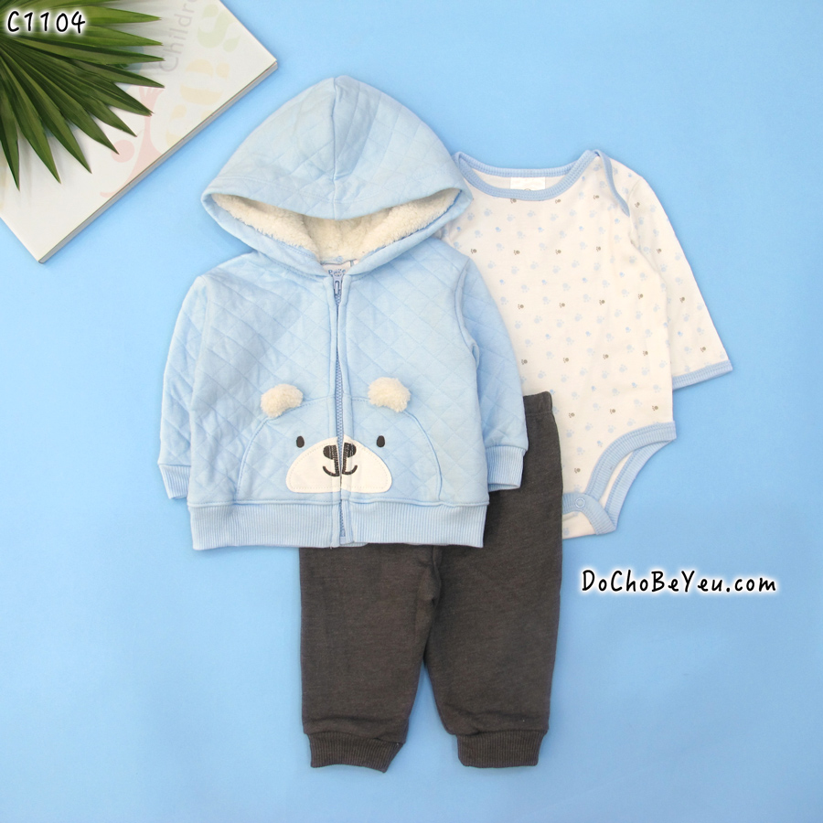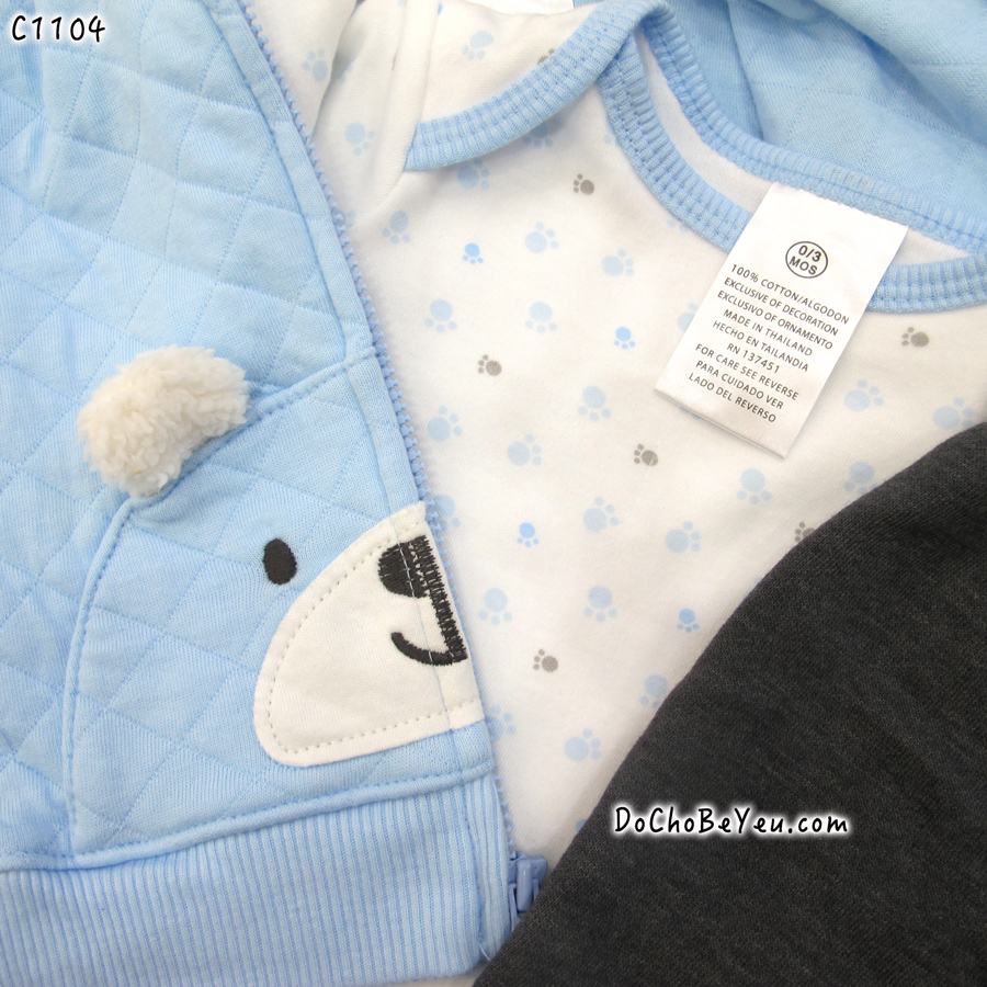 Đồ sơ sinh Xuất Khẩu Thái Lan set 3 món gồm 1 áo thun, 1 quần dài và 1 áo khoác thiết kế cùng tông màu, hài hòa, nam tính cho bé trai. Sản phẩm quần áo trẻ sơ sinh Made in Thái Lan 100% an toàn cho bé, không gây dị ứng hoặc mẩn ngứa cho bé.