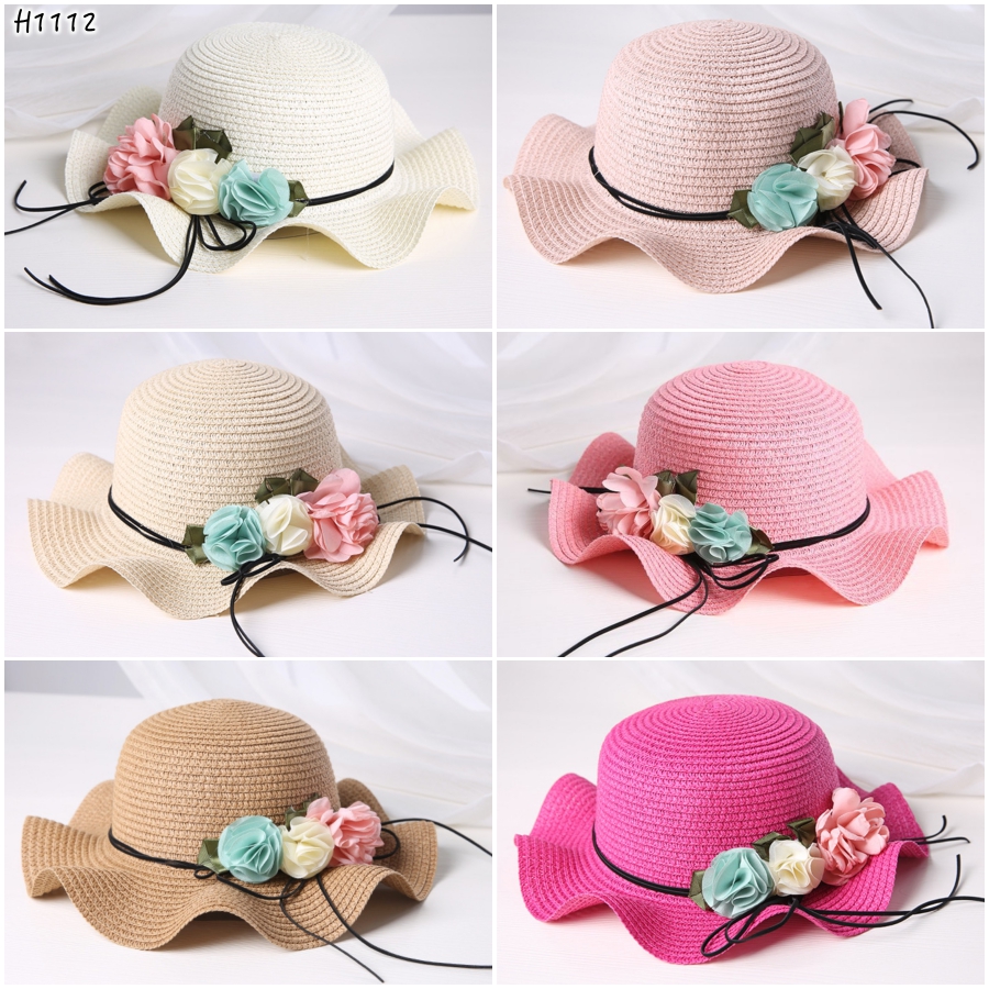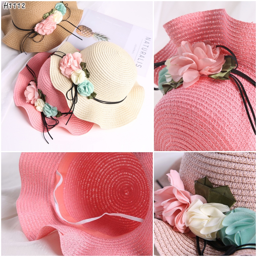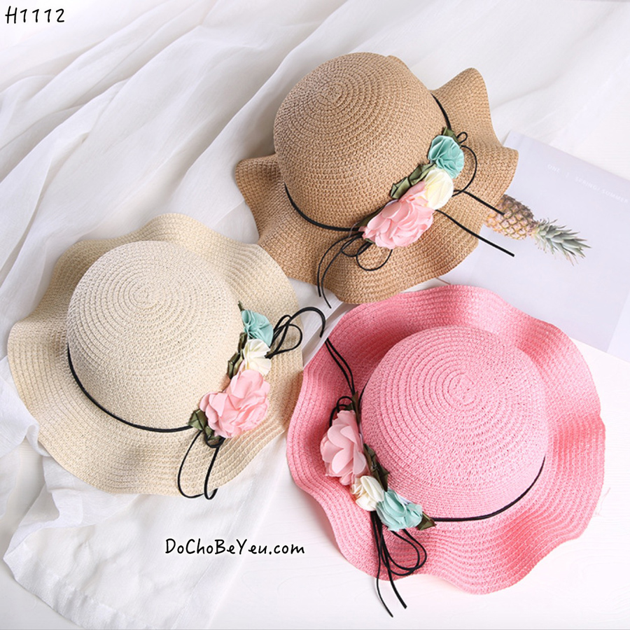 Mũ cói rộng vành cho bé gái quai đeo. Thiết kế lạ mắt, dễ thương với những bông hoa , sẽ là một phụ kiện đáng yêu và vô cùng hoàn hảo cho bé những bức hình đẹp trong mùa hè này.