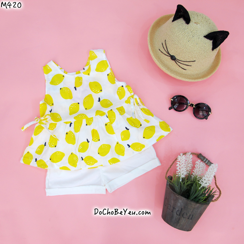 Quần áo bé gái 1-2-3-4 tuổi chất vải thô mát mẻ cho mùa hè. Màu vàng tươi tắn, mát mắt, dễ thương, quần lưng thun thoải mái, dễ mặc. Giá 170k/set.