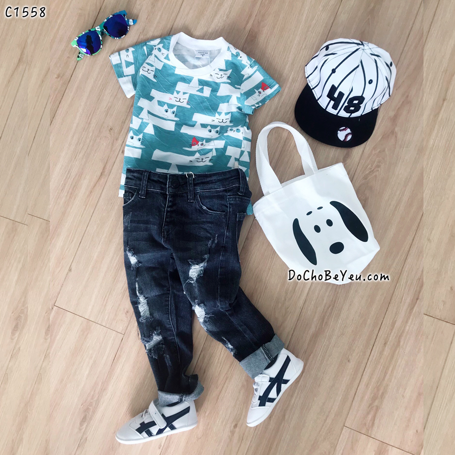 . -Quần jean dài size 9 tháng -4 tuổi . 220k .Aó thun 110k .Nón 90k.Kính 85k .