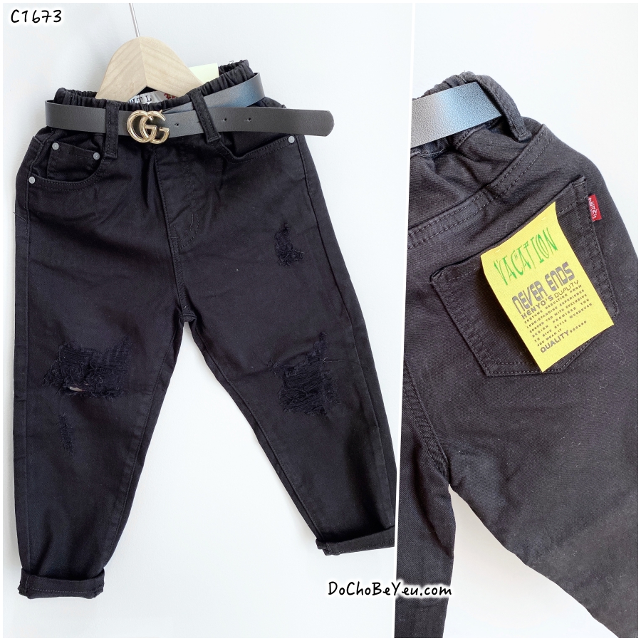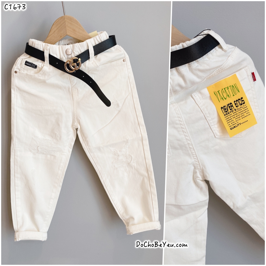 - Quần jean cho bé trai size nhí 9 tháng đến 3 tuổi : chất liệu jean xịn, cực mềm mại, co dãn, lưng thun thoải mái cho bé nhỏ. Nỗi lo ám ảnh khi mặc quần jean cứng, dày, khó chịu các bé nhỏ sẽ không bao giờ có nữa với chất liệu jean mới này. Giá 225k (không bao gồm dây nịt). Mẫu quần kaki rách màu trắng - đen lưng thun co dãn giá 205k.
