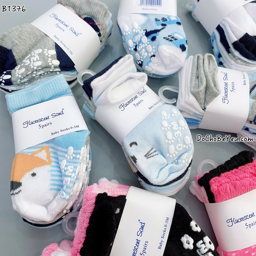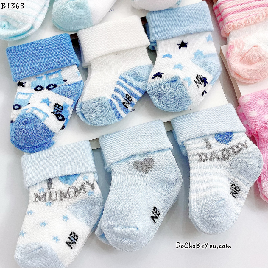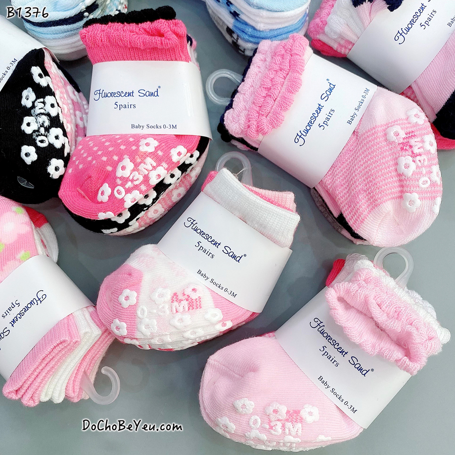Set 5 đôi tất - vớ cho bé sơ sinh 0-3 tháng, cổ bẻ dễ thương, màu sắc - hoa văn ngọt ngào. Co dãn tốt. Xem clip quay cận cảnh chất lượng sản phẩm tại đây: https://www.youtube.com/watch?v=1jBtYQbKjGk
