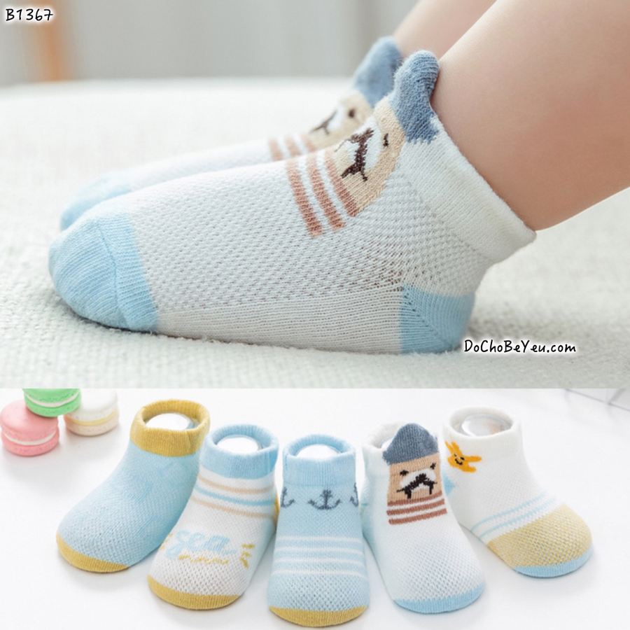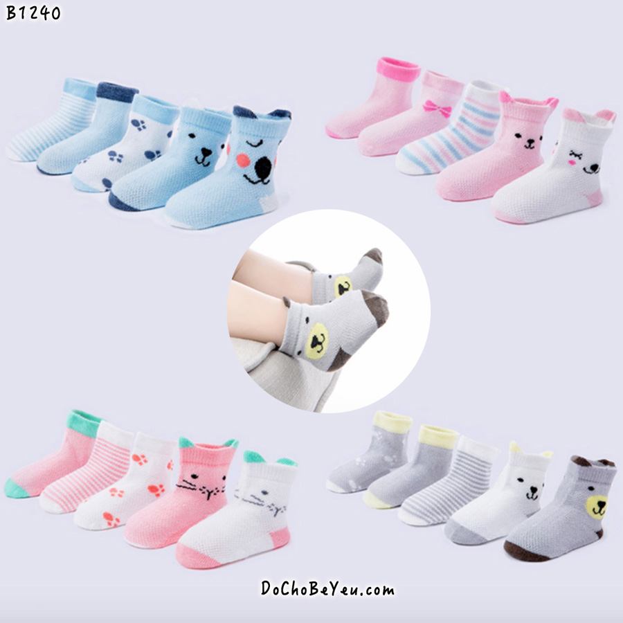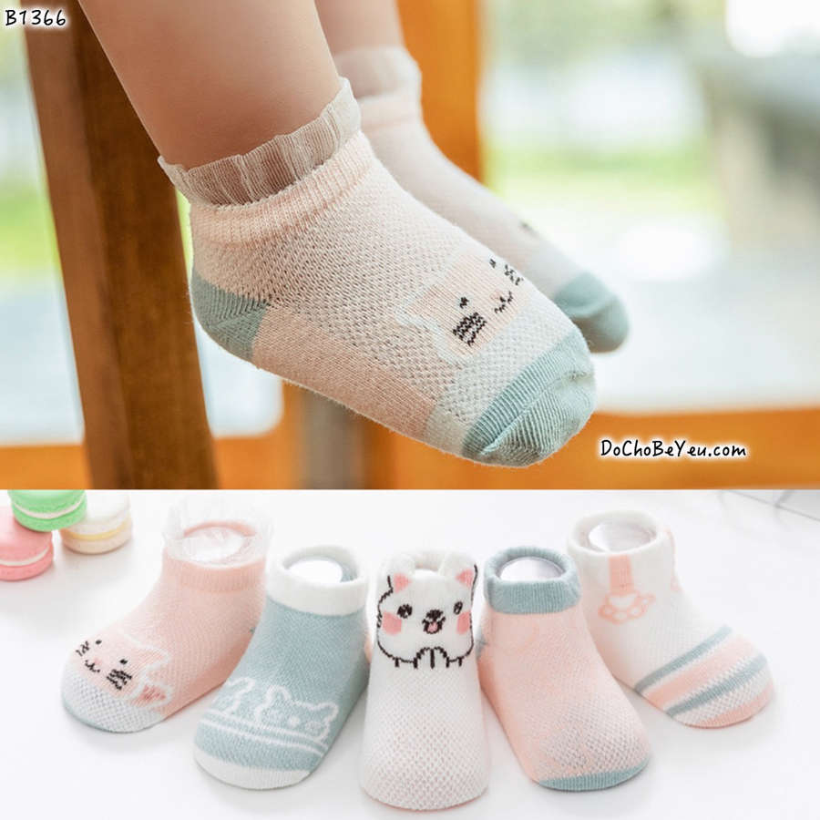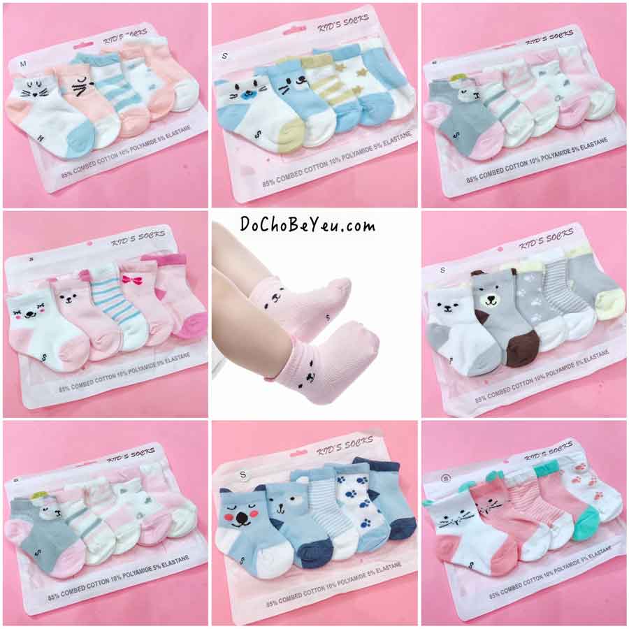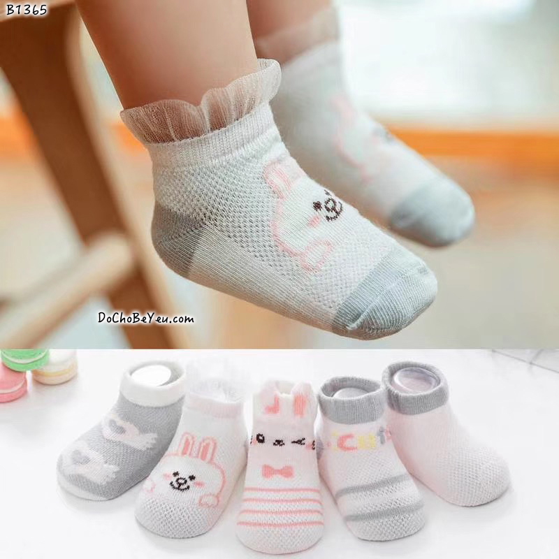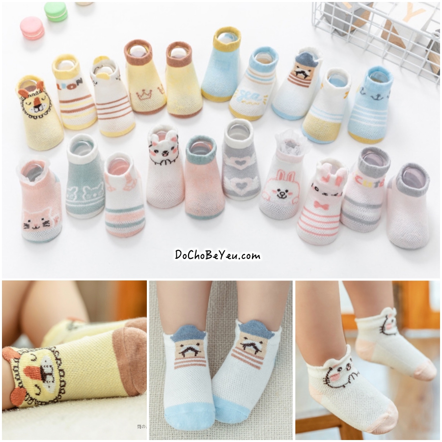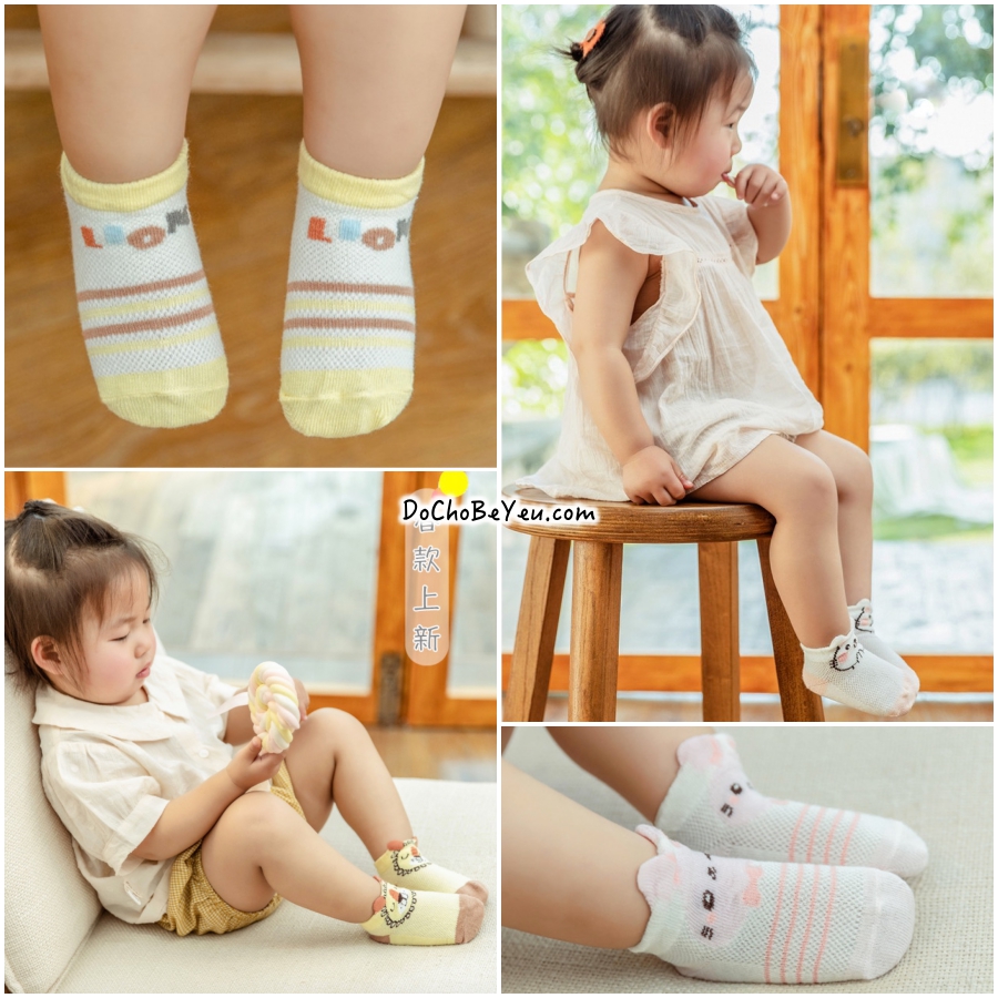 - Set gồm 5 đôi vớ lưới cho bé sơ sinh đựng trong túi zip xinh xắn, giá chỉ 65k/set , có nhiều màu nhiều hình lựa chọn. Chất liệu nhẹ nhàng, sợi đan lưới thông thoáng, mát mẻ, thiết kế đặc biệt của Hàn Quốc thích hợp cho trẻ sơ sinh vào mùa hè. Màu sắc, họa tiết dễ thương, thiết kế kiểu dáng dễ thương, thời trang, thoải mái vận động, dễ mang, không bó cổ chân bé.